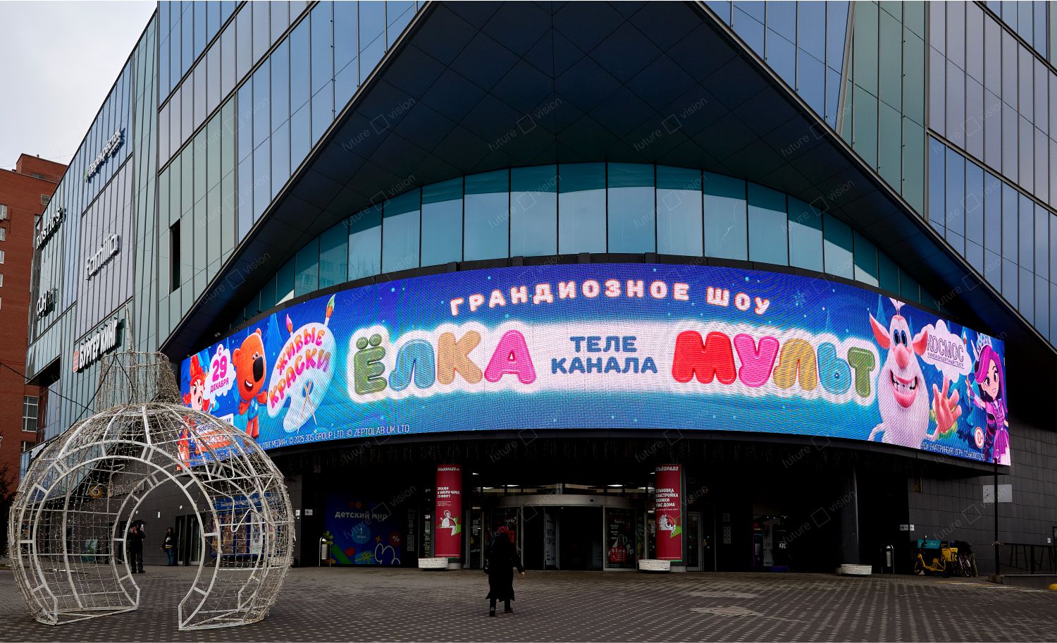 Специалисты завода Future Vision изготовили и установили светодиодный экран для торгово-развлекательного центра «Алатырь», город Екатеринбург. Размер светодиодного полотна составляет ___, площадь экрана __ м2, шаг пикселя Р5.